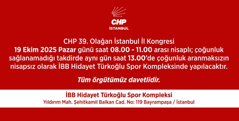 CHP 39. Olağan İstanbul İl Kongresi 19 Ekim 2025 Pazar günü saat 08.00-11.00 arası nisaplı; çoğunluk sağlanamadığı takdirde aynı gün saat 13.00’te çoğunluk aranmaksızın nisapsız olarak İBB Hidayet Türkoğlu Spor Kompleksinde yapılacaktır.